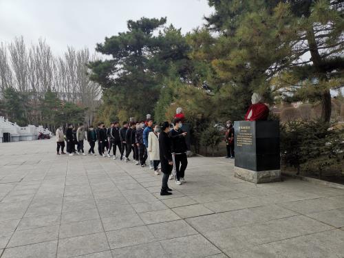 活动中,支部全体成员面向烈士纪念碑肃立,王浩东作为学生党员代表致辞,表达了对革命先烈的无限哀思和敬仰之情,诉说新时代大学生必将继承先烈遗志,发扬革命精神,以昂扬的革命斗志投入到学习中去,加强学习,努力锻炼,作新时代合格的建设者和接班人。全体党员面向烈士纪念碑默哀。之后,学生党支部书记王丽老师带领学生们瞻仰英雄塑像,讲述革命先烈的英雄事迹,重温党的光辉历史。